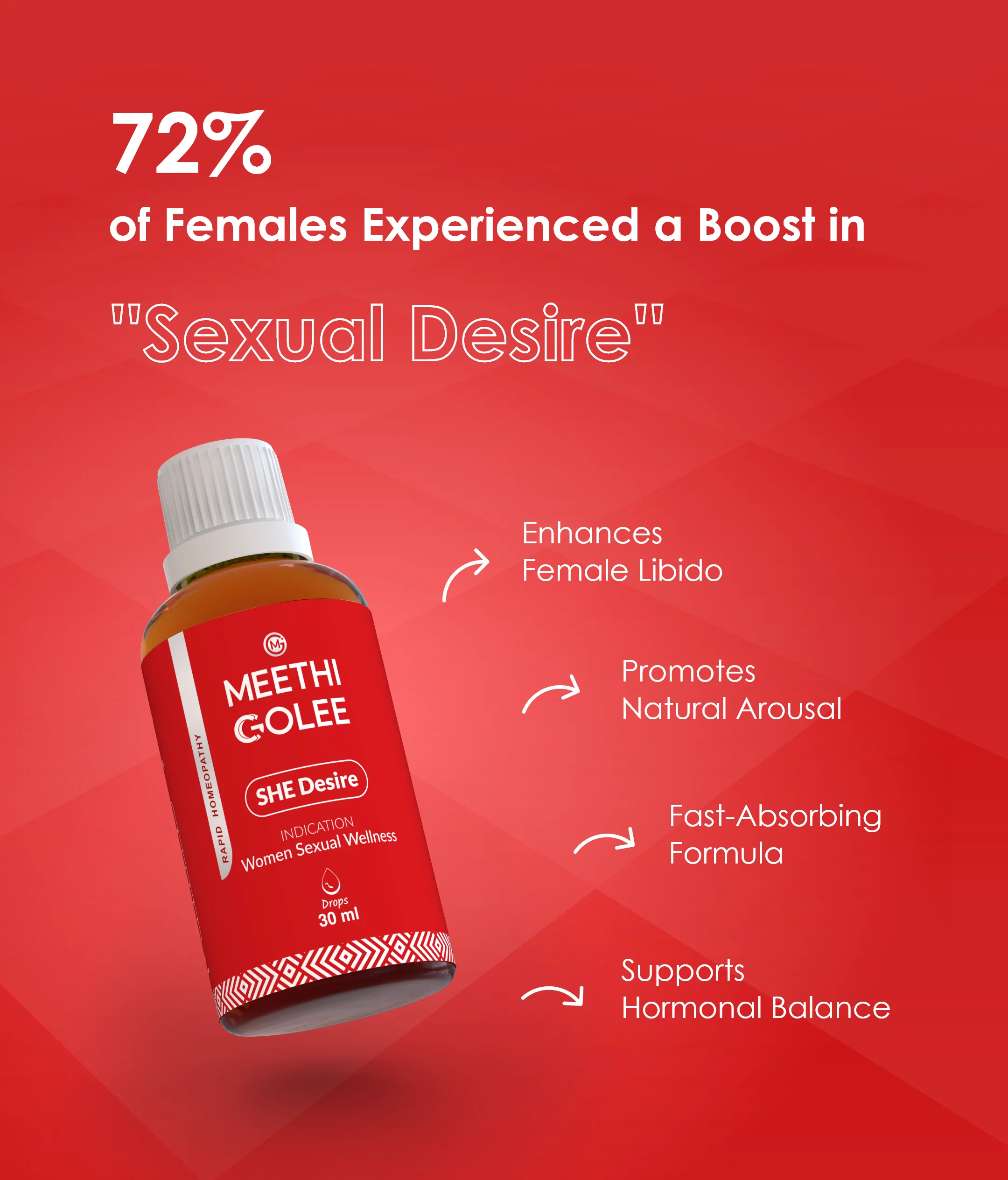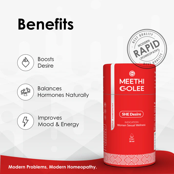 SHE Desire is an advanced homeopathic formula crafted to support women’s sexual wellness, improve libido, and bring emotional and hormonal balance. It helps enhance natural arousal, mood, and vitality—gently and naturally.